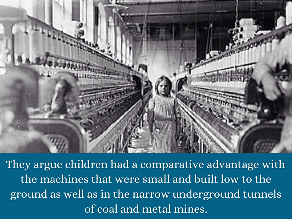 They argue children had a comparative advantage with the machines that were small and built low to the ground as well as in the narrow underground tunnels of coal and metal mines.