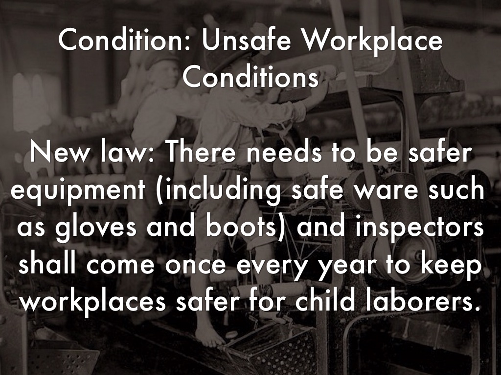 New law: There needs to be safer equipment (including safe ware such as gloves and boots) and inspectors shall come once every year to keep workplaces safer for child laborers.