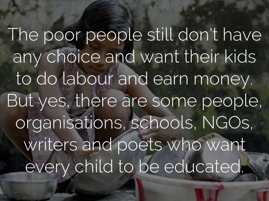 The poor people still don't have any choice and want their kids to do labour and earn money. But yes, there are some people, organisations, schools, NGOs, writers and poets who want every child to be educated.