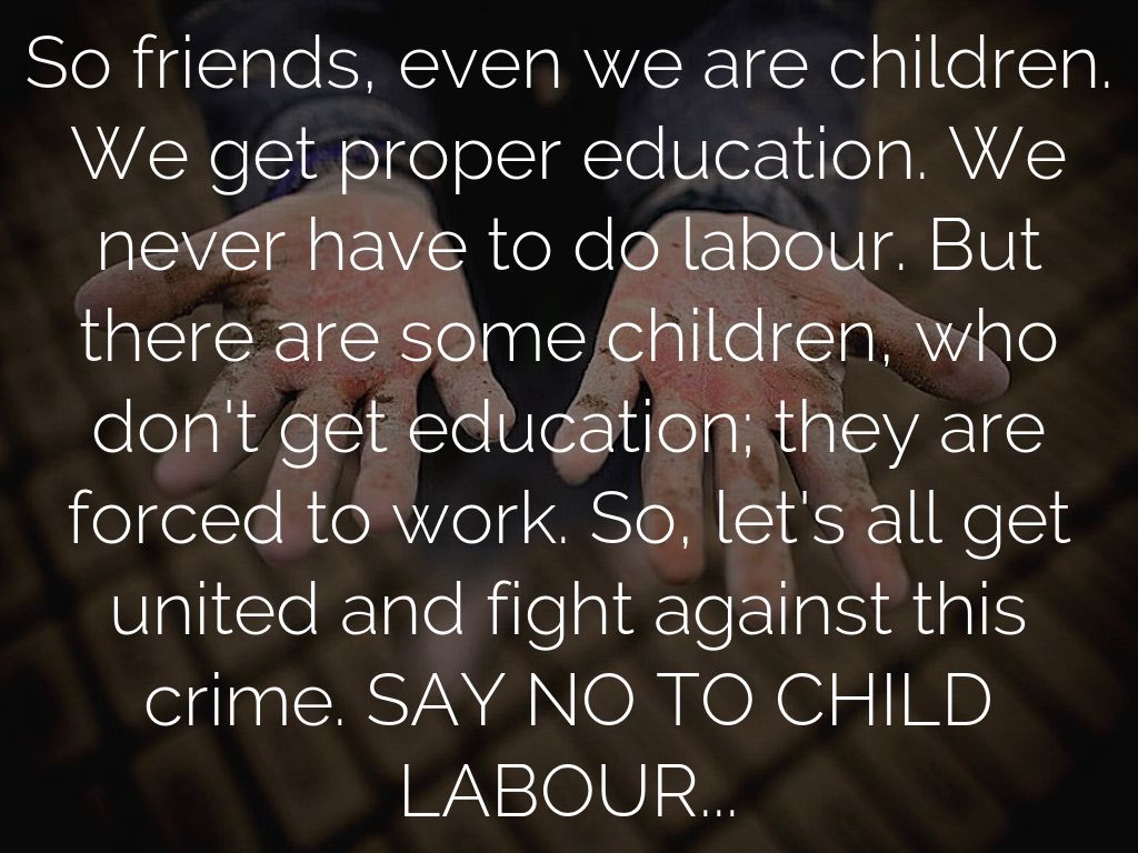 So friends, even we are children. We get proper education. We never have to do labour. But there are some children, who don't get education; they are forced to work. So, let's all get united and fight against this crime. SAY NO TO CHILD LABOUR...