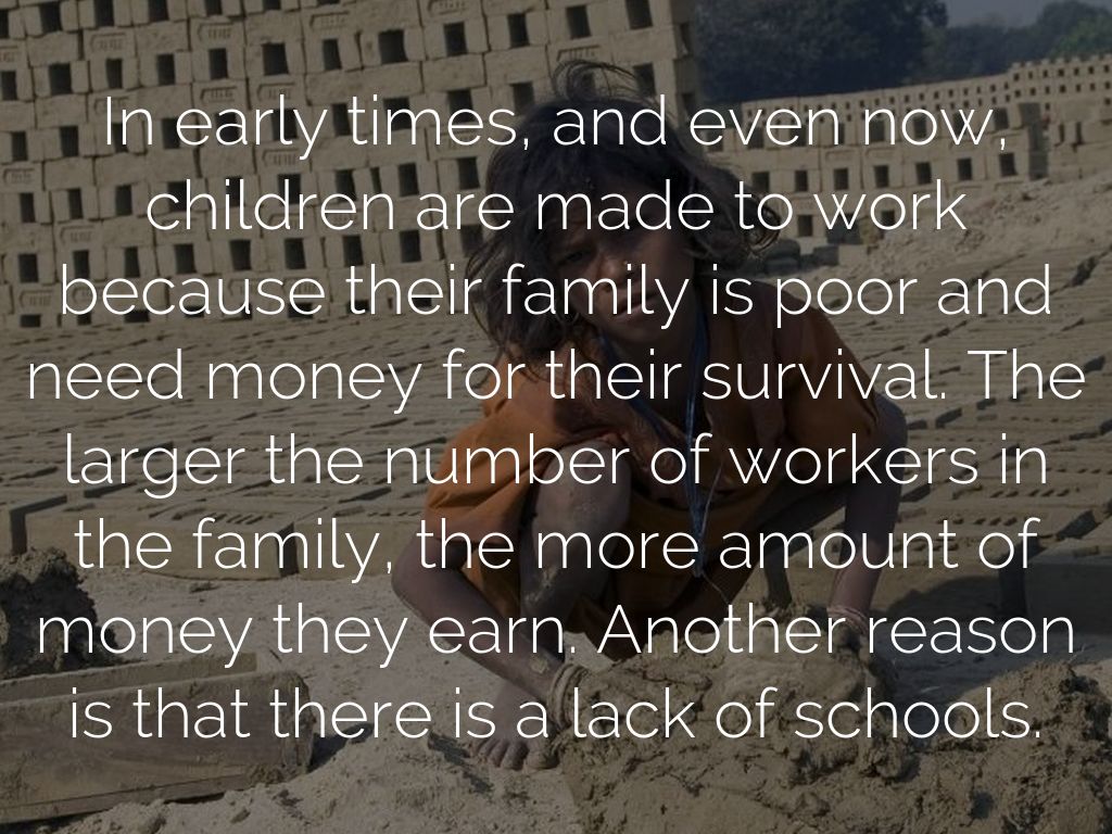 In early times, and even now, children are made to work because their family is poor and need money for their survival. The larger the number of workers in the family, the more amount of money they earn. Another reason is that there is a lack of schools.