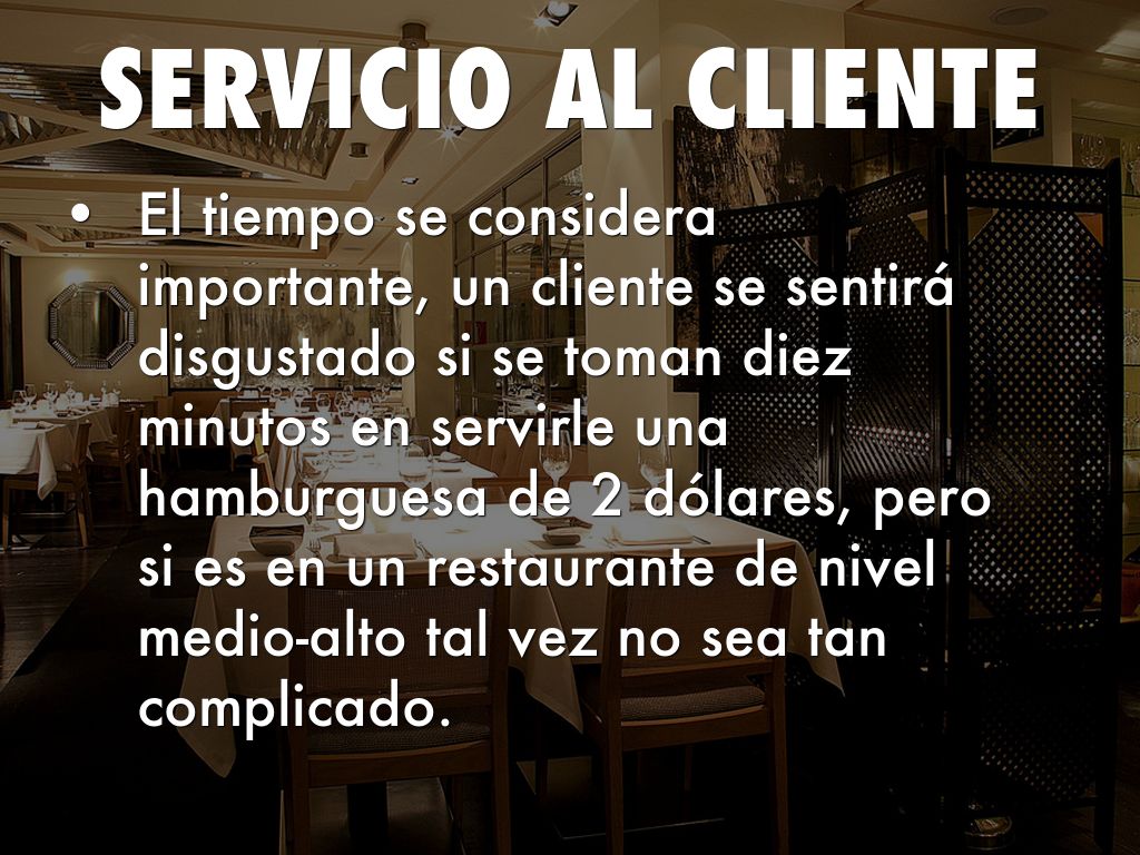 • El tiempo se considera importante, un cliente se sentirá disgustado si se toman diez minutos en servirle una hamburguesa de 2 dólares, pero si es en un restaurante de nivel medio-alto tal vez no sea tan complicado.