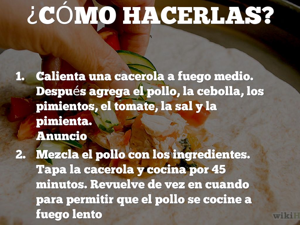 - Calienta una cacerola a fuego medio. Después agrega el pollo, la cebolla, los pimientos, el tomate, la sal y la pimienta.