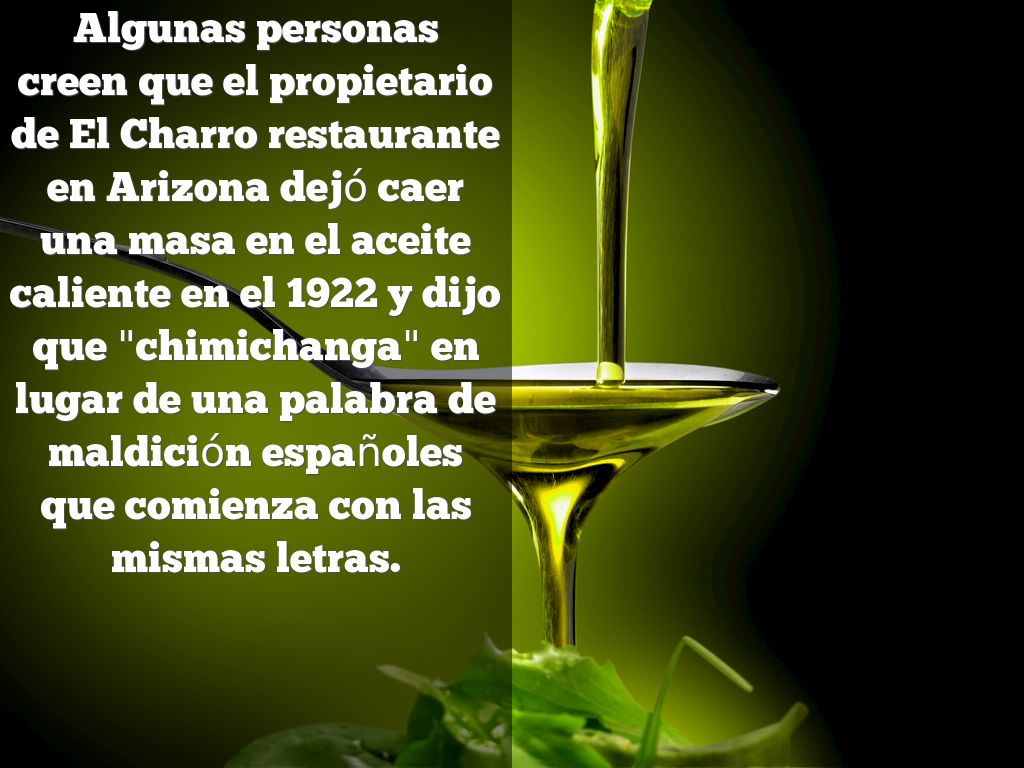 creen que el propietario de El Charro restaurante en Arizona dejó caer una masa en el aceite caliente en el 1922 y dijo que "chimichanga" en lugar de una palabra de maldición españoles que comienza con las mismas letras.