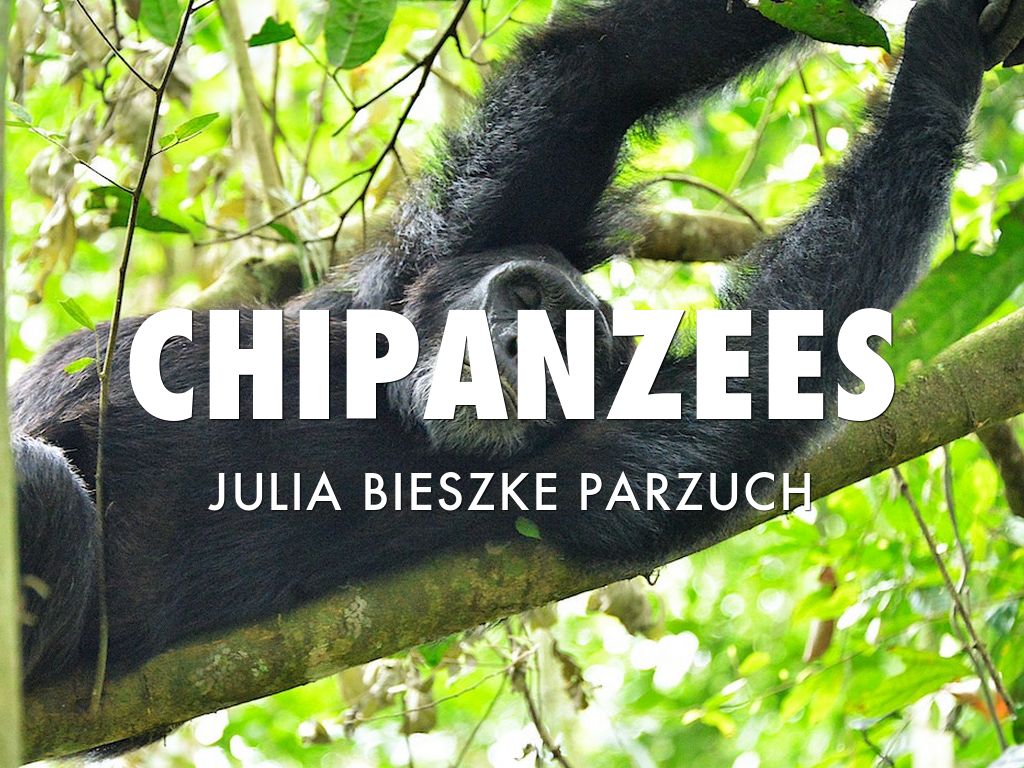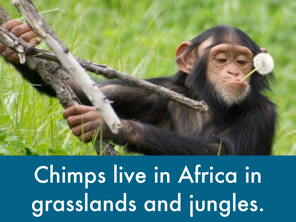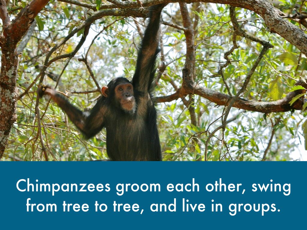 Chimpanzees groom each other, swing from tree to tree, and live in groups.