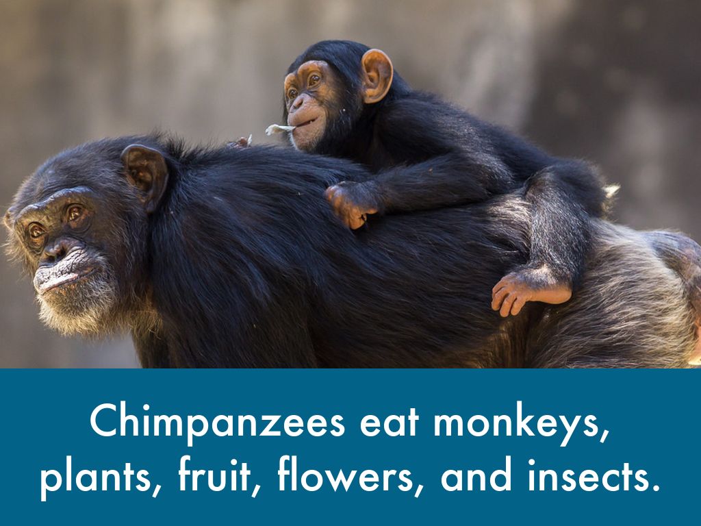 Chimpanzees eat monkeys, plants, fruit, flowers, and insects.