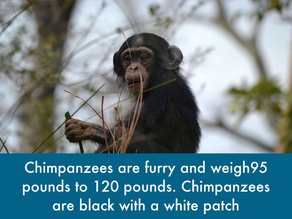 Chimpanzees are furry and weigh95 pounds to 120 pounds. Chimpanzees are black with a white patch