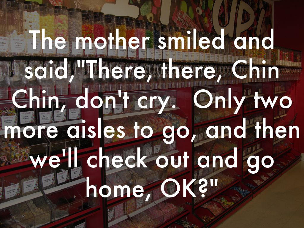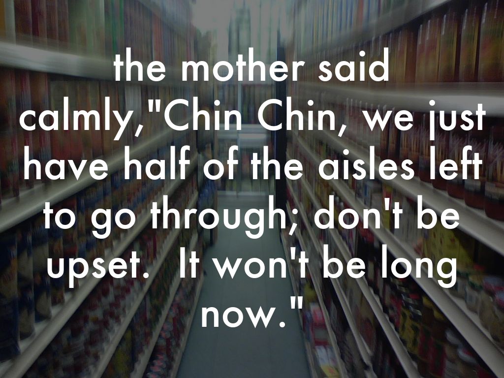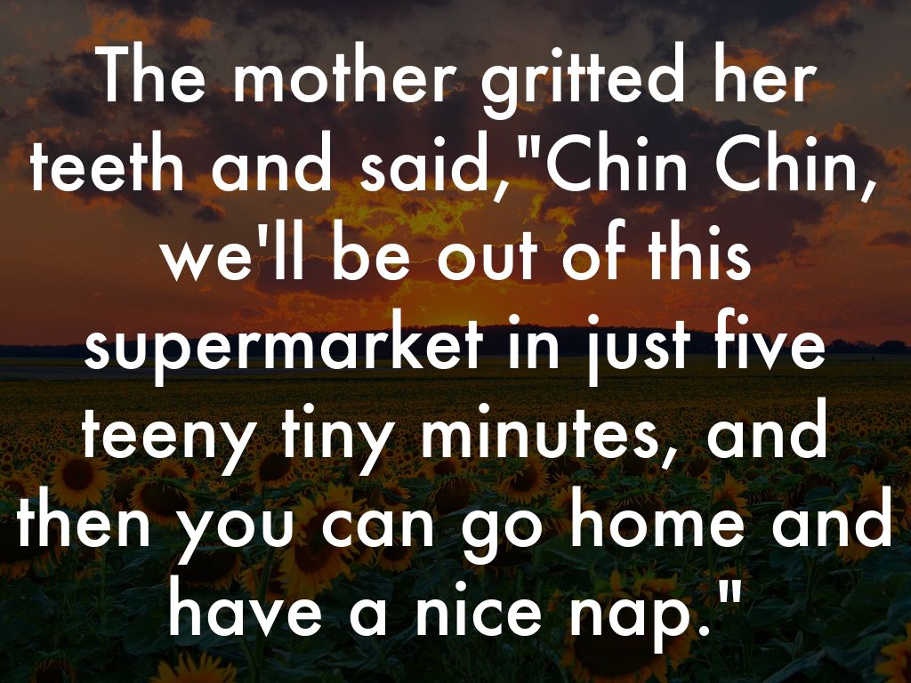 The mother gritted her teeth and said,"Chin Chin, we'll be out of this supermarket in just five teeny tiny minutes, and then you can go home and have a nice nap."