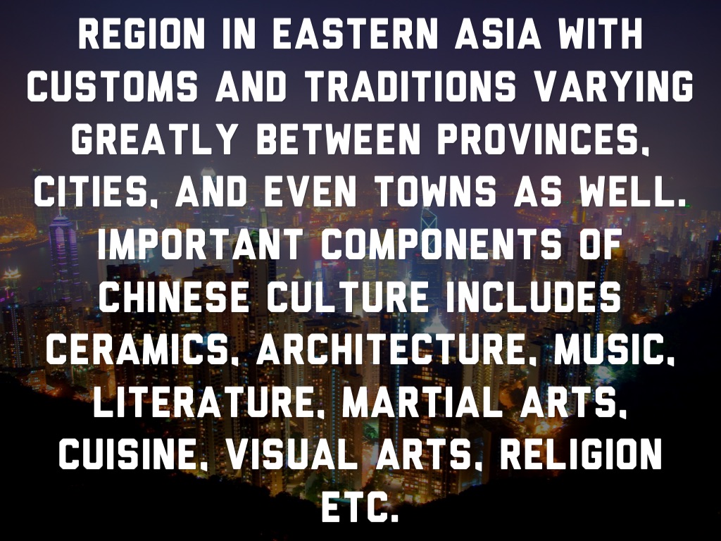Chinese culture (Chinese: 中国文化; pinyin: Zhōngguó wénhuà) is one of the world's oldest cultures.[1][2] The area in which the culture is dominant covers a large geographical region in eastern Asia with customs and traditions varying greatly between provinces, cities, and even towns as well. Important components of Chinese culture includes ceramics, architecture, music, literature, martial arts, cuisine, visual arts, religion etc.