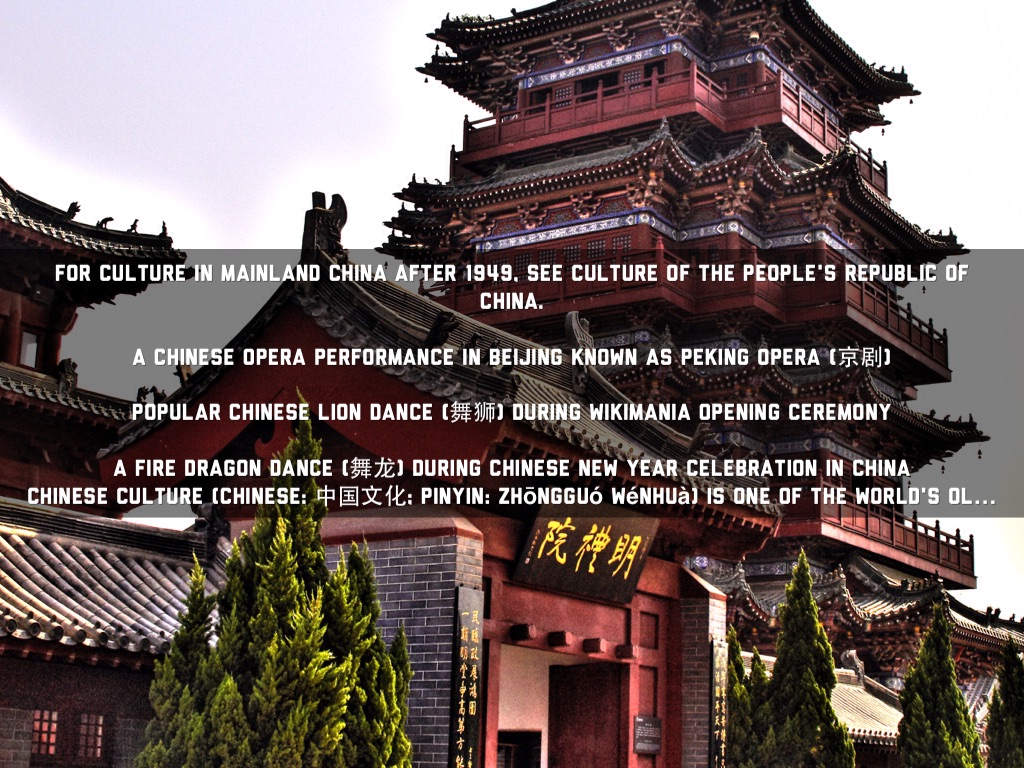 Chinese culture (Chinese: 中国文化; pinyin: Zhōngguó wénhuà) is one of the world's oldest cultures.[1][2] The area in which the culture is dominant covers a large geographical..