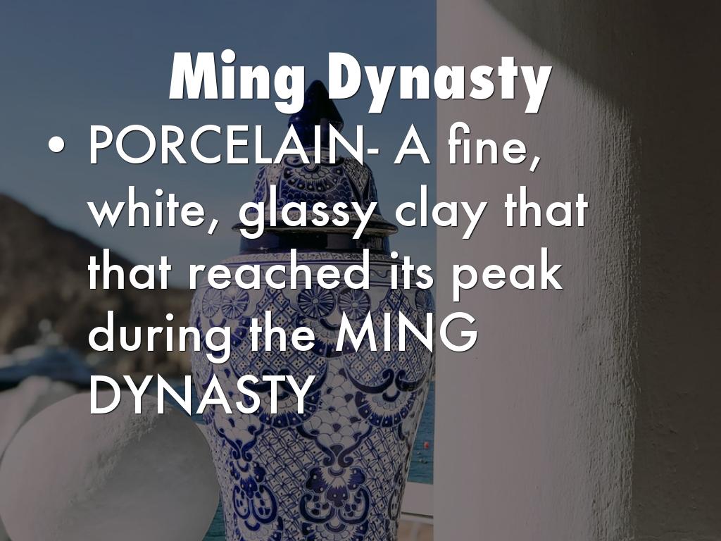 PORCELAIN- A fine, white, glassy clay that that reached its peak during the MING DYNASTY