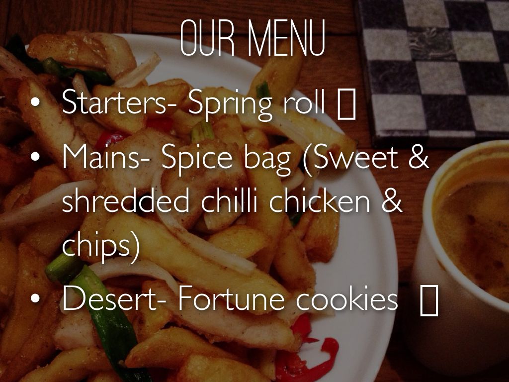 • Mains- Spice bag (Sweet & shredded chilli chicken & chips)
