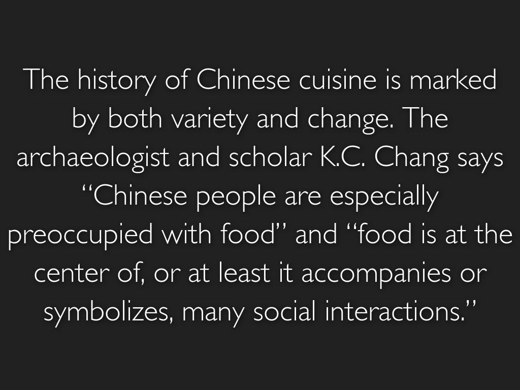 The history of Chinese cuisine is marked by both variety and change. The archaeologist and scholar K.C. Chang says “Chinese people are especially preoccupied with food” and “food is at the center of, or at least it accompanies or symbolizes, many social interactions.”