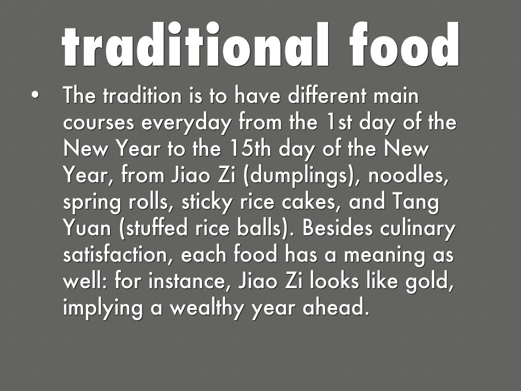 - The tradition is to have different main courses everyday from the 1st day of the New Year to the 15th day of the New Year, from Jiao Zi (dumplings), noodles, spring rolls, sticky rice cakes, and Tang Yuan (stuffed rice balls). Besides culinary satisfaction, each food has a meaning as well: for instance, Jiao Zi looks like gold, implying a wealthy year ahead.