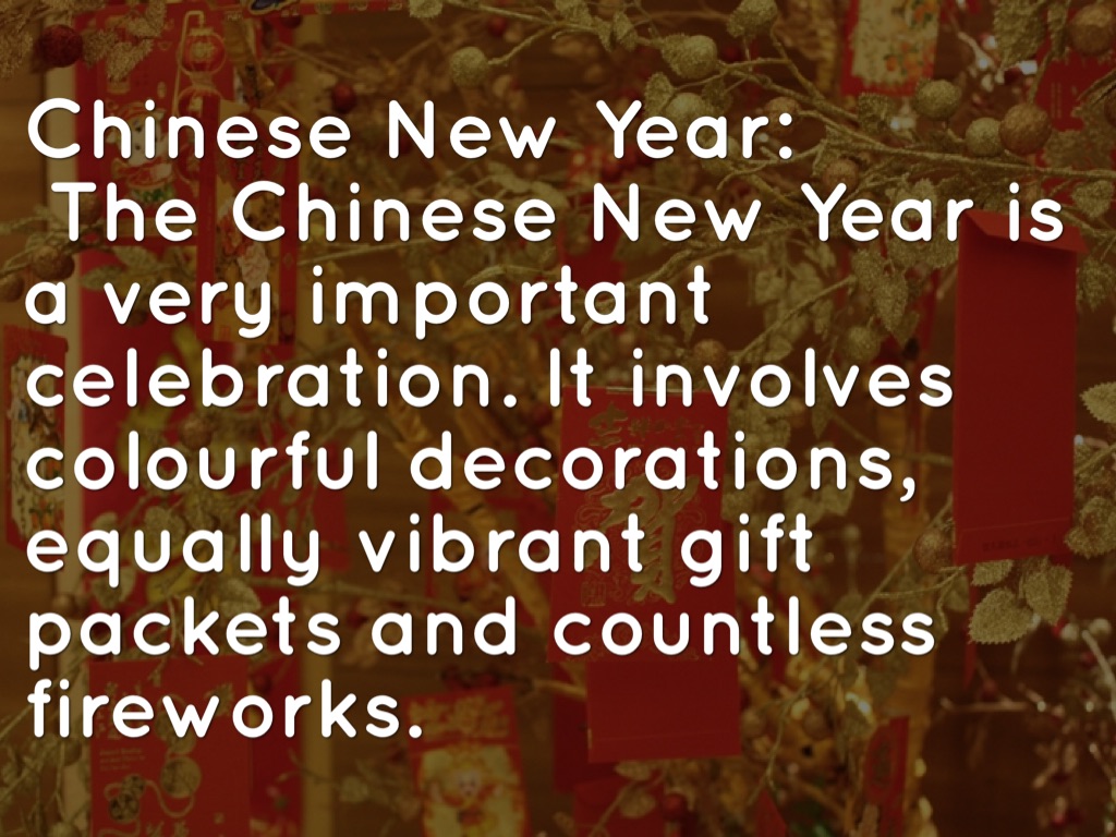 The Chinese New Year is a very important celebration. It involves colourful decorations, equally vibrant gift packets and countless fireworks.