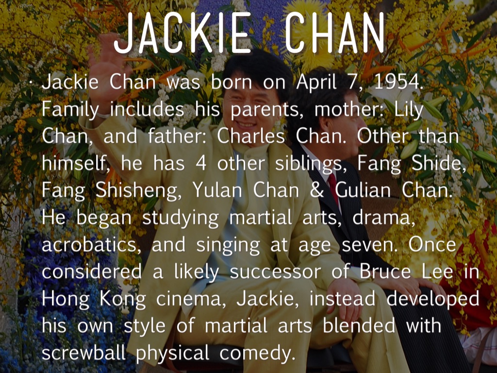 Jackie Chan was born on April 7, 1954. Family includes his parents, mother: Lily Chan, and father: Charles Chan. Other than himself, he has 4 other siblings, Fang Shide, Fang Shisheng, Yulan Chan & Gulian Chan. He began studying martial arts, drama, acrobatics, and singing at age seven. Once considered a likely successor of Bruce Lee in Hong Kong cinema, Jackie, instead developed his own style of martial arts blended with screwball physical comedy.