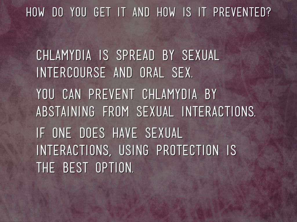 You can prevent Chlamydia by abstaining from sexual interactions.