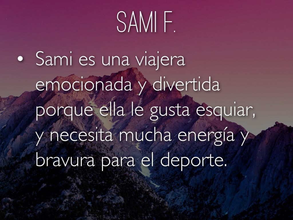 Sami es una viajera emocionada y divertida porque ella le gusta esquiar, y necesita mucha energía y bravura para el deporte.