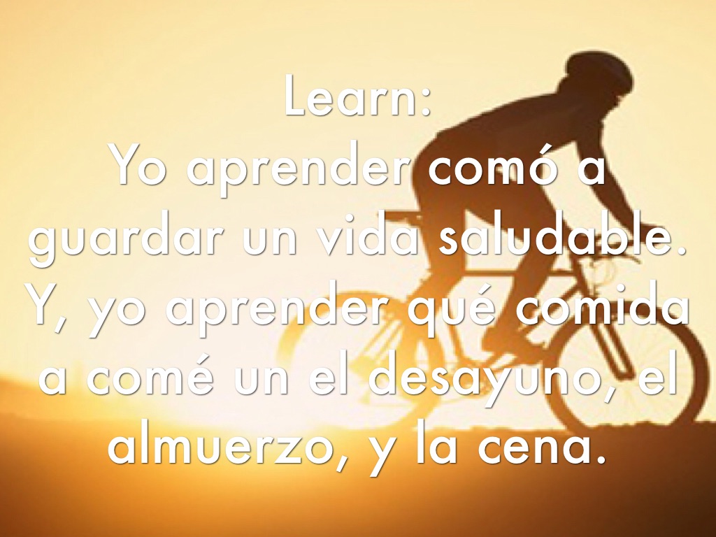 Yo aprender comó a guardar un vida saludable. Y, yo aprender qué comida a comé un el desayuno, el almuerzo, y la cena.