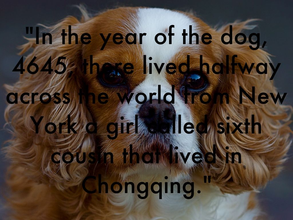 "In the year of the dog, 4645, there lived halfway across the world from New York a girl called sixth cousin that lived in Chongqing."