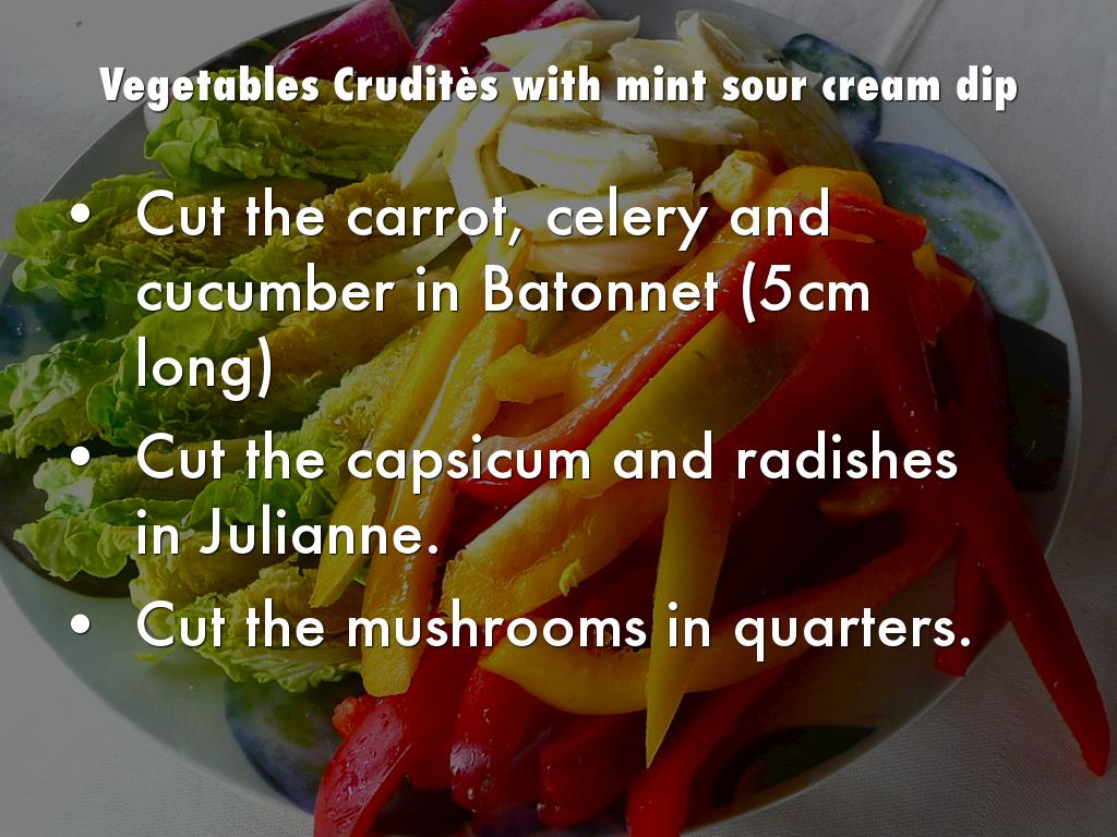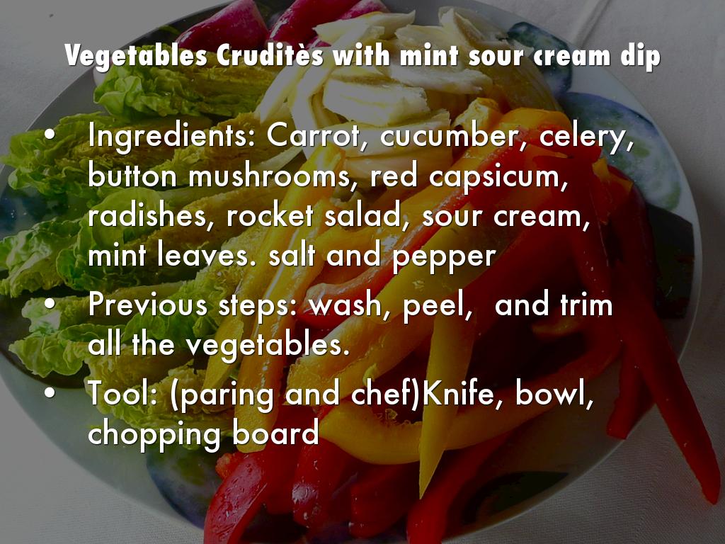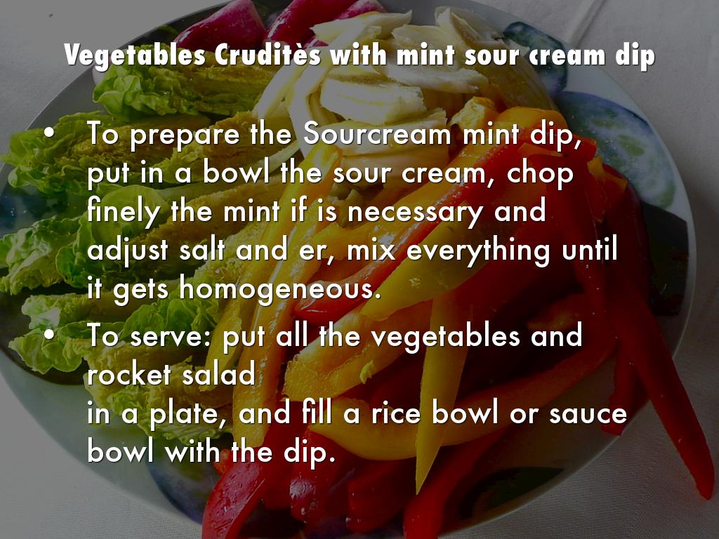To prepare the Sourcream mint dip, put in a bowl the sour cream, chop finely the mint if is necessary and adjust salt and er, mix everything until it gets homogeneous.