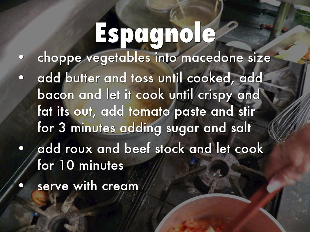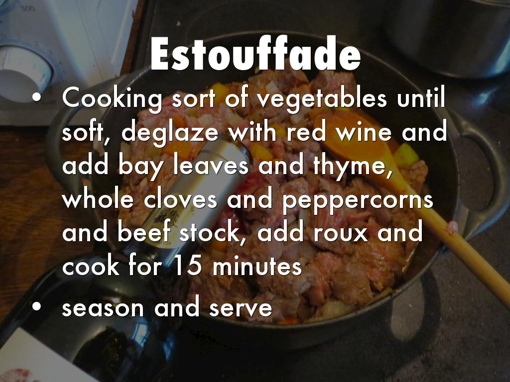 Cooking sort of vegetables until soft, deglaze with red wine and add bay leaves and thyme, whole cloves and peppercorns and beef stock, add roux and cook for 15 minutes