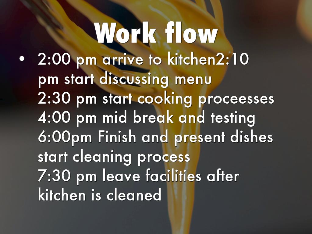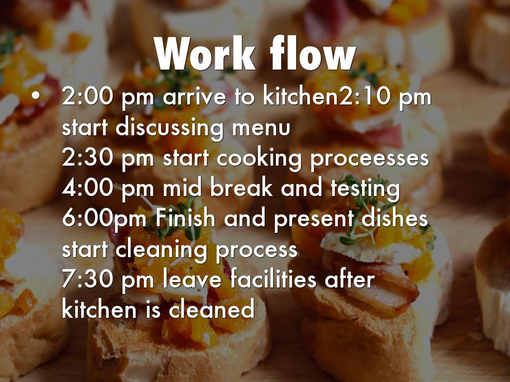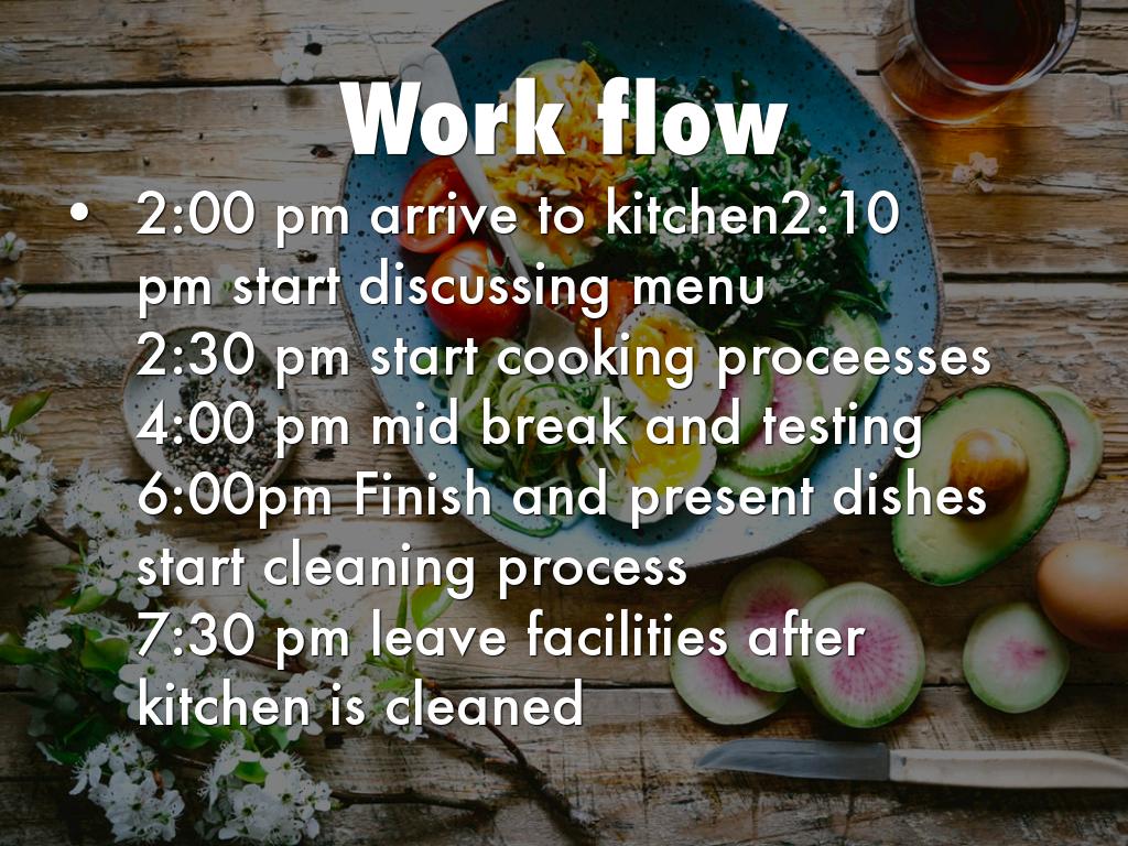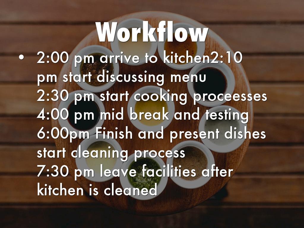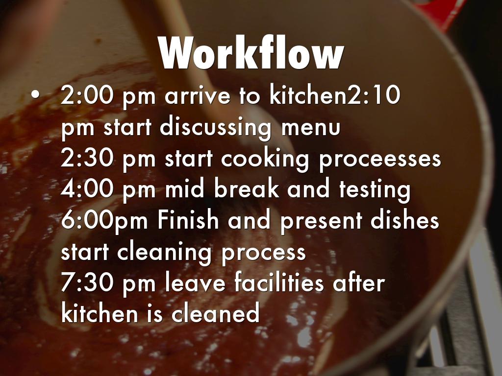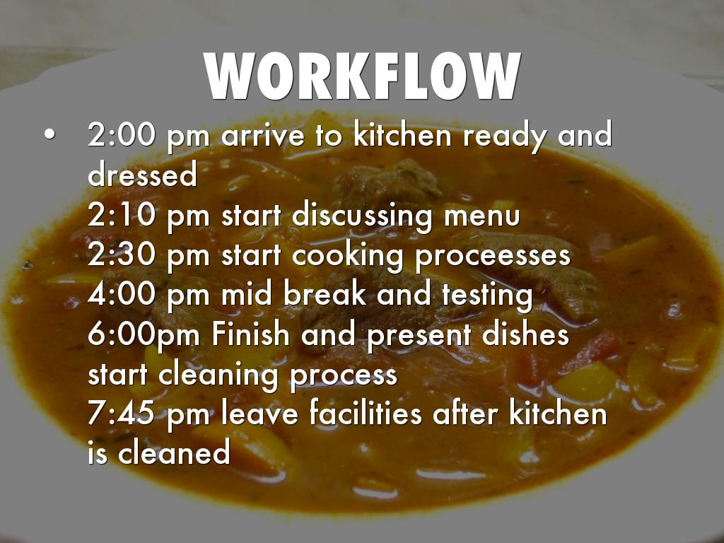 6:00pm Finish and present dishes start cleaning process