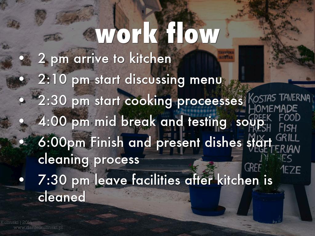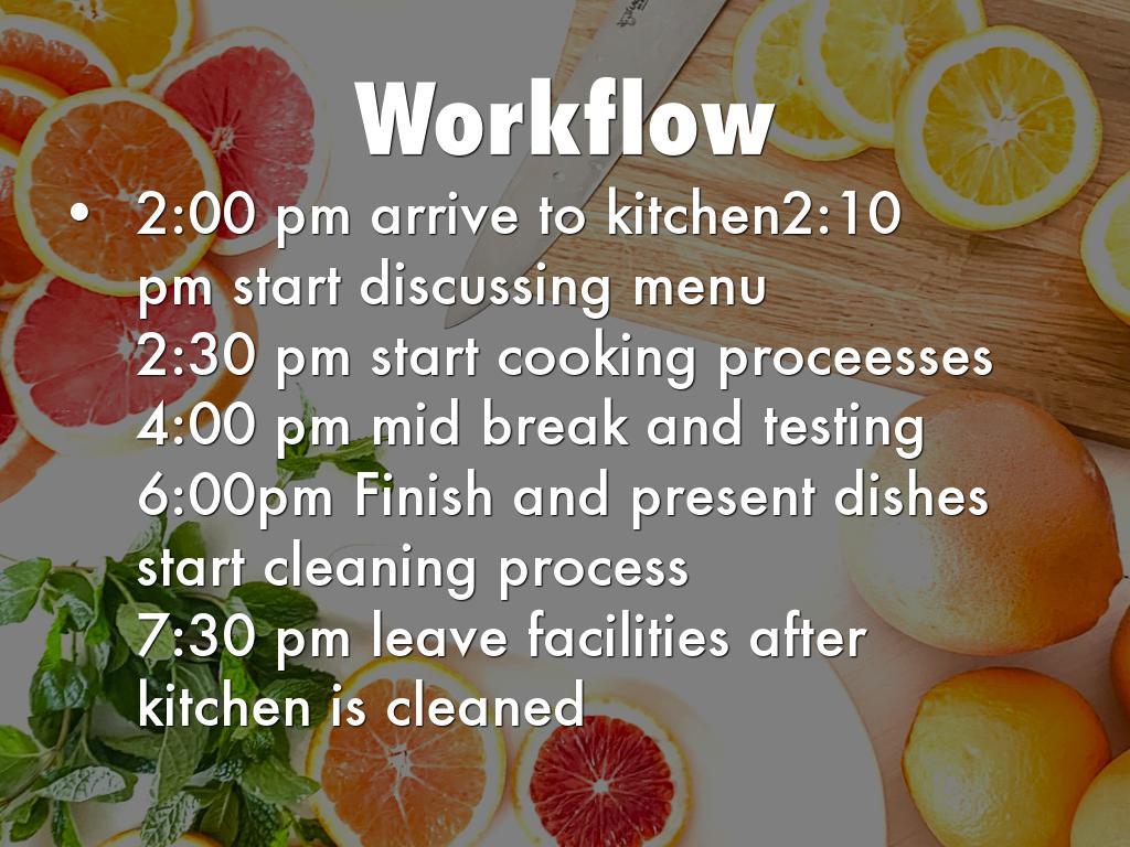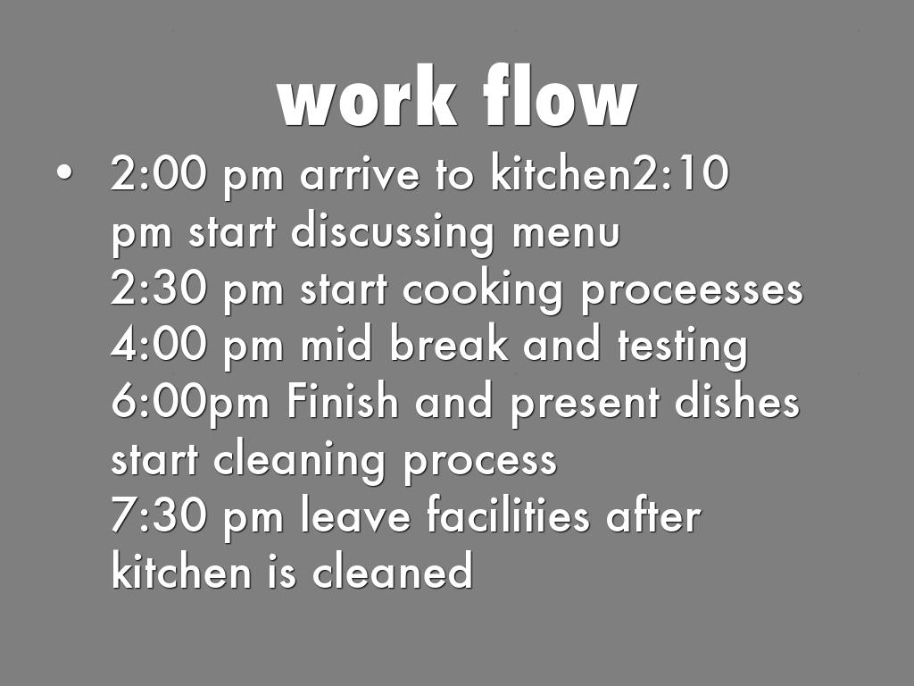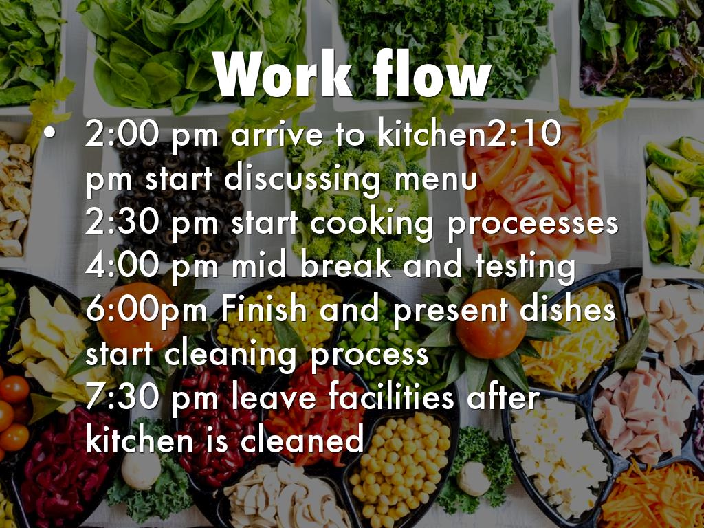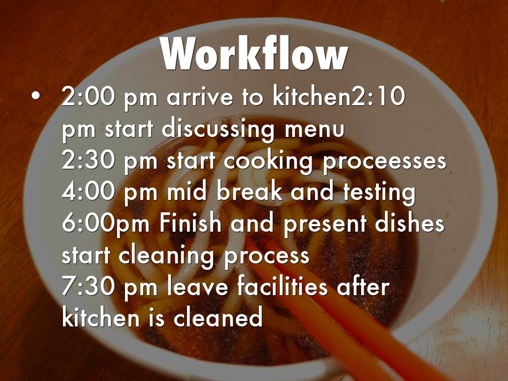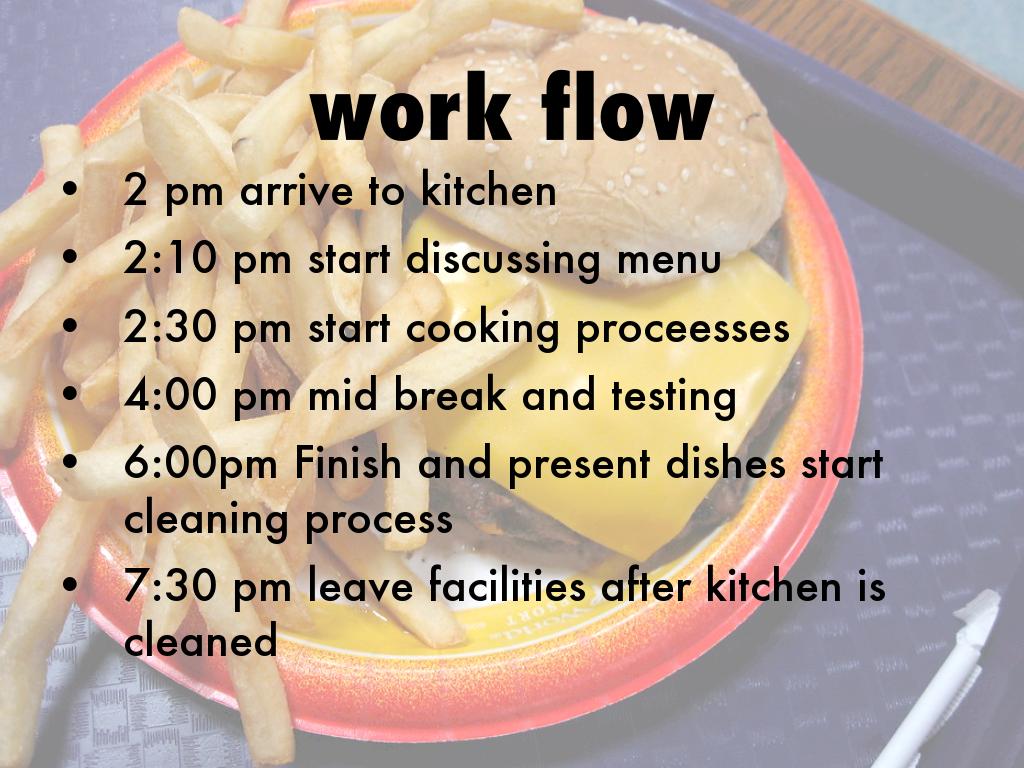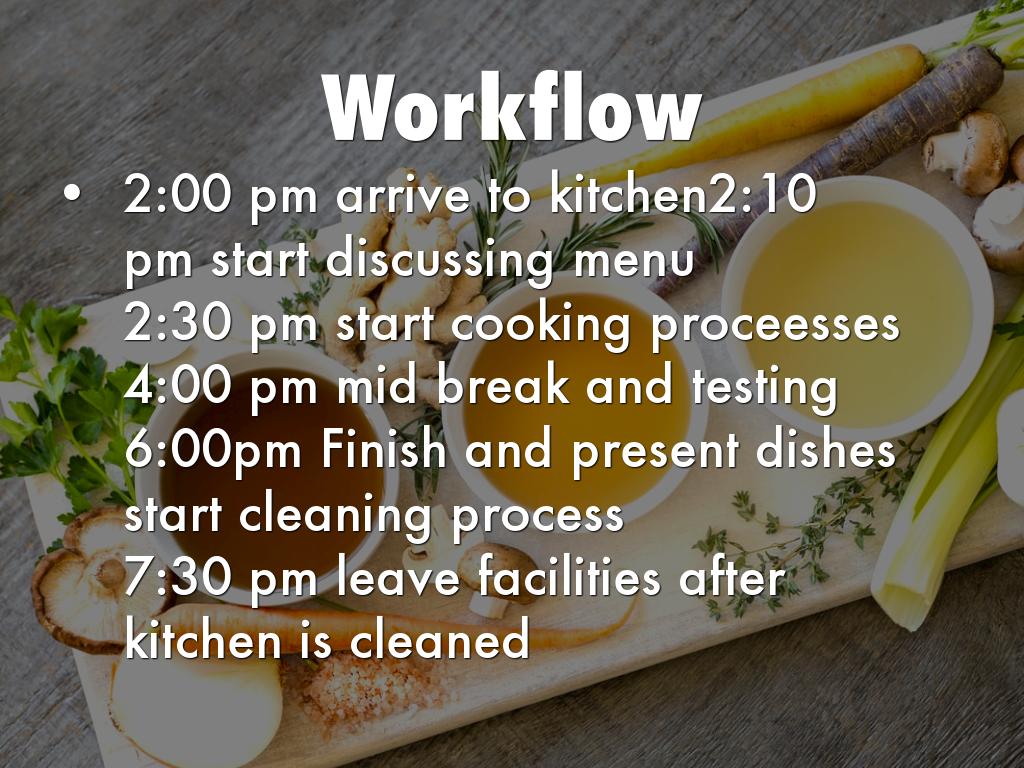 6:00pm Finish and present dishes start cleaning process