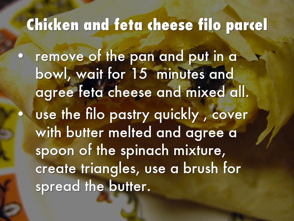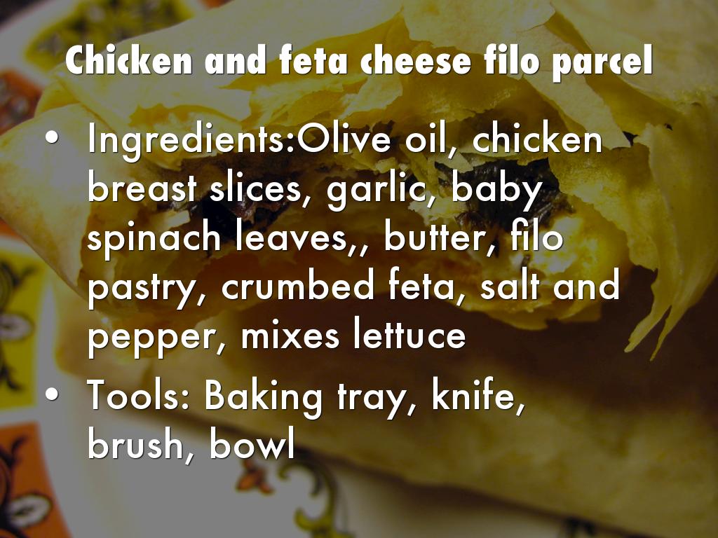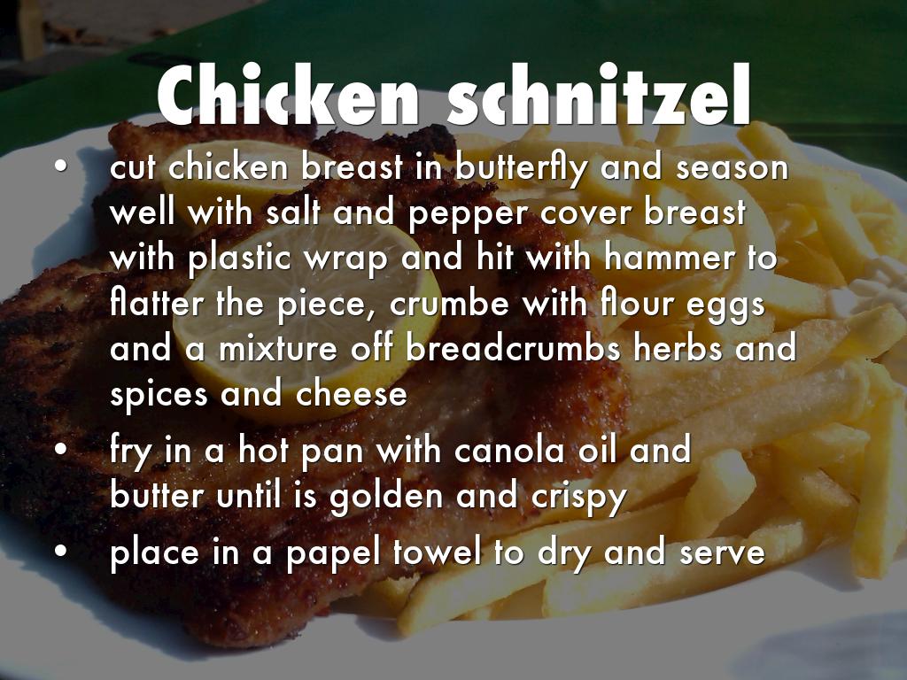 cut chicken breast in butterfly and season well with salt and pepper cover breast with plastic wrap and hit with hammer to flatter the piece, crumbe with flour eggs and a mixture off breadcrumbs herbs and spices and cheese