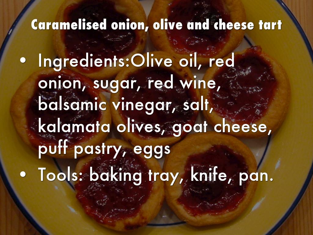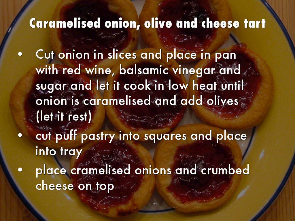 Cut onion in slices and place in pan with red wine, balsamic vinegar and sugar and let it cook in low heat until onion is caramelised and add olives (let it rest)