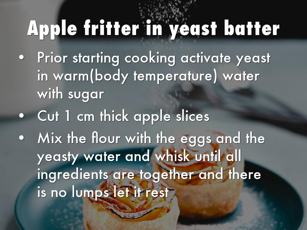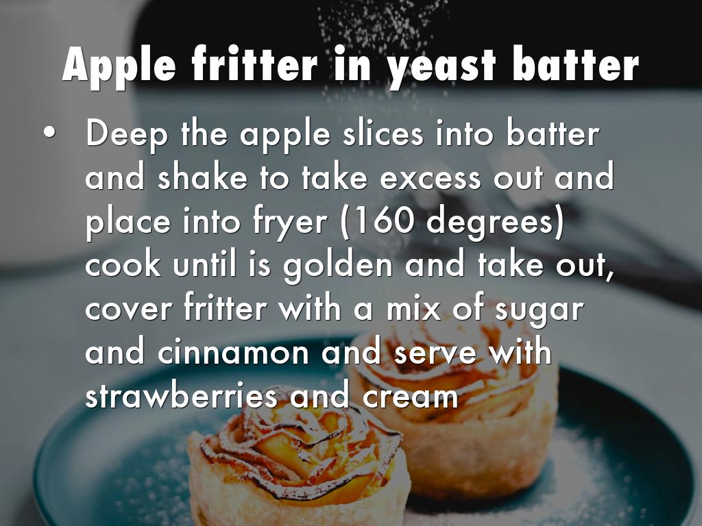 Deep the apple slices into batter and shake to take excess out and place into fryer (160 degrees) cook until is golden and take out, cover fritter with a mix of sugar and cinnamon and serve with strawberries and cream