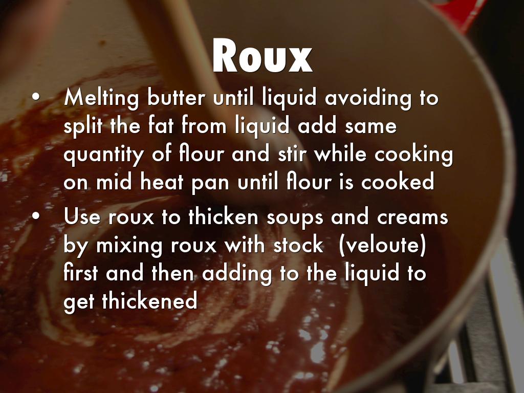 Use roux to thicken soups and creams by mixing roux with stock (veloute) first and then adding to the liquid to get thickened