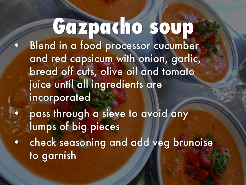 Blend in a food processor cucumber and red capsicum with onion, garlic, bread off cuts, olive oil and tomato juice until all ingredients are incorporated