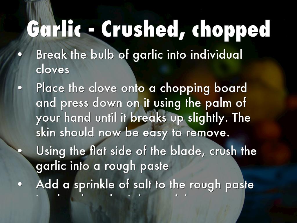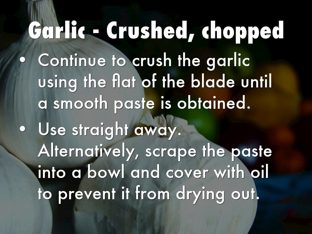 Using the flat side of the blade, crush the garlic into a rough paste