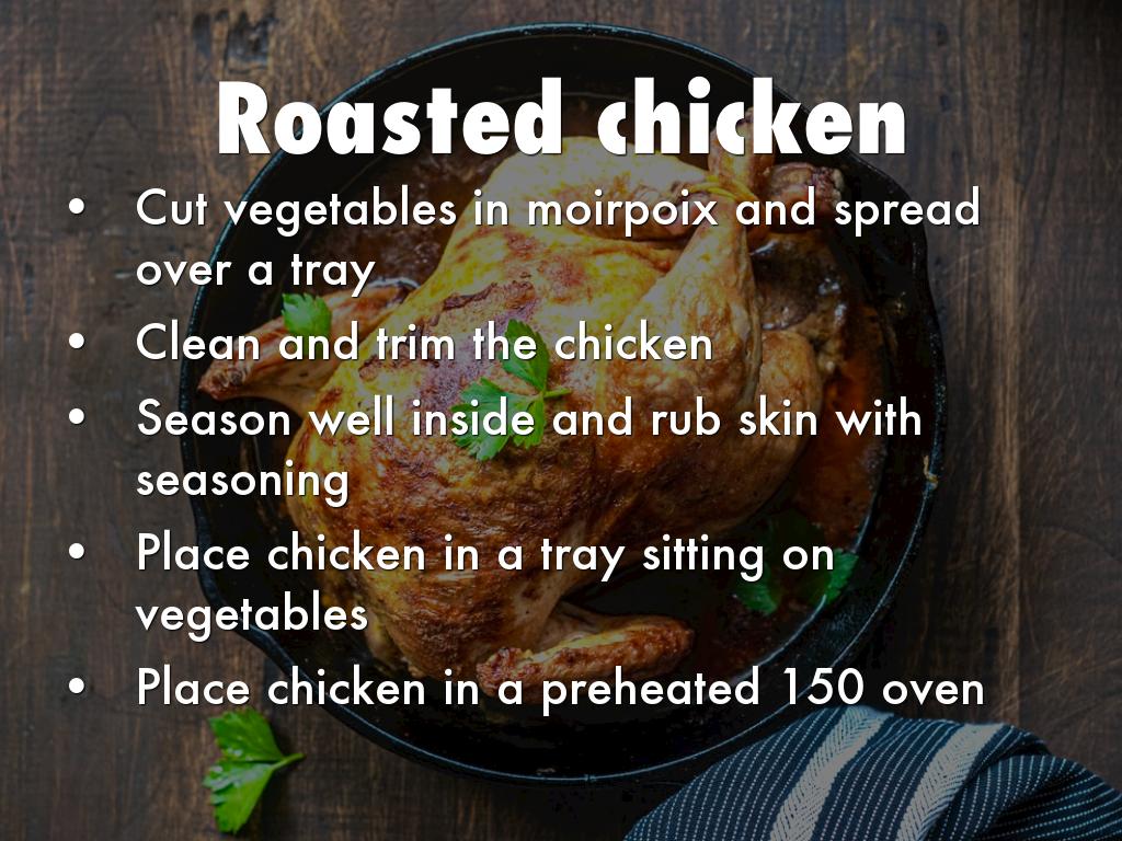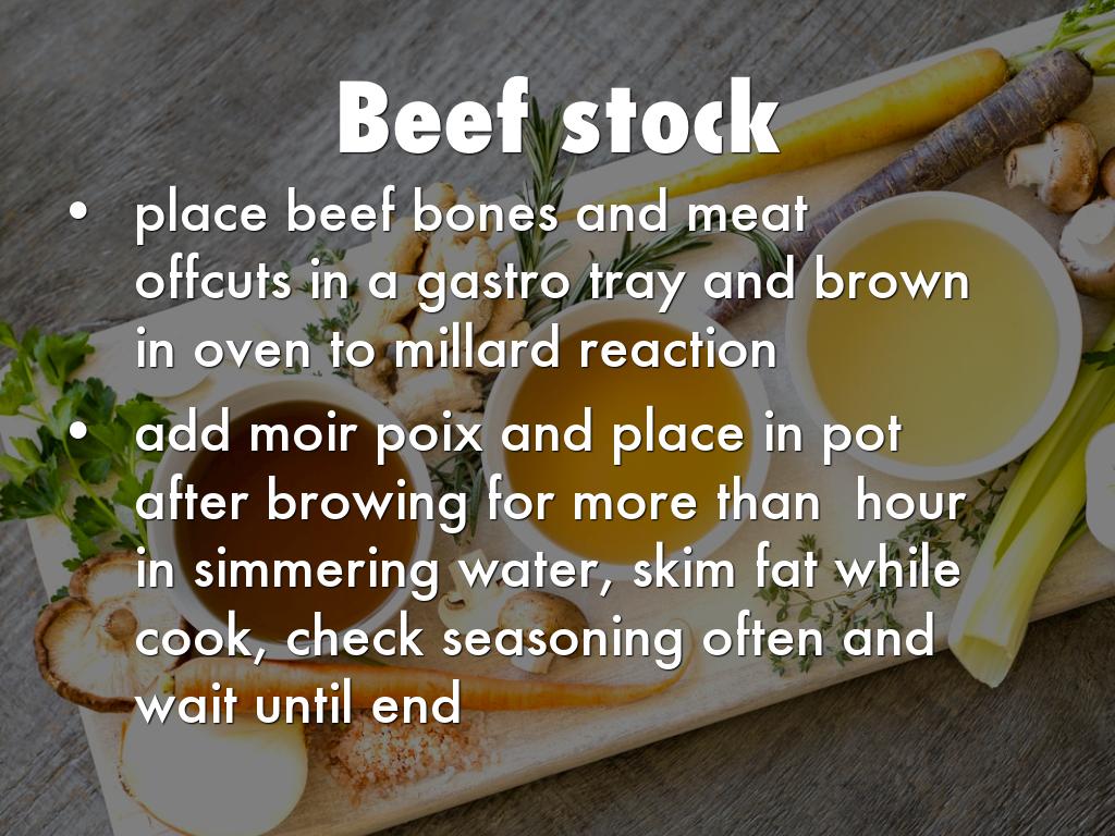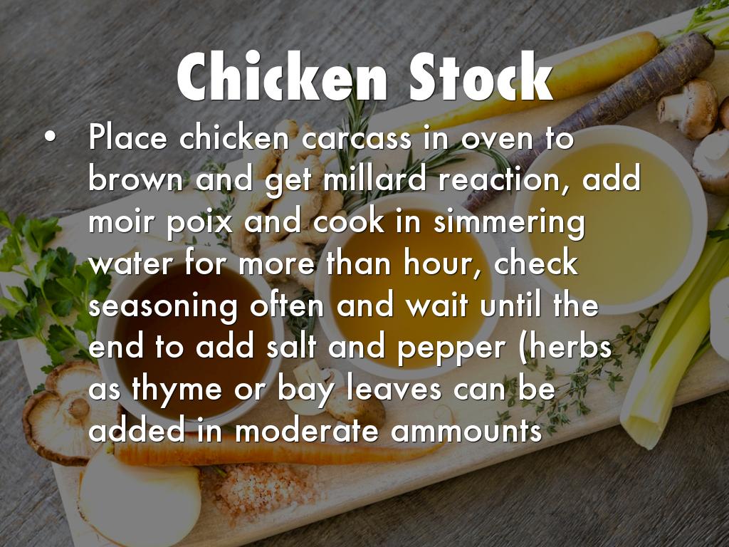 Place chicken carcass in oven to brown and get millard reaction, add moir poix and cook in simmering water for more than hour, check seasoning often and wait until the end to add salt and pepper (herbs as thyme or bay leaves can be added in moderate ammounts