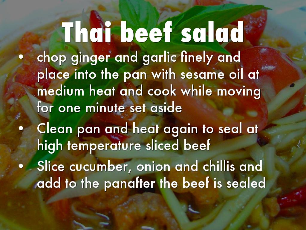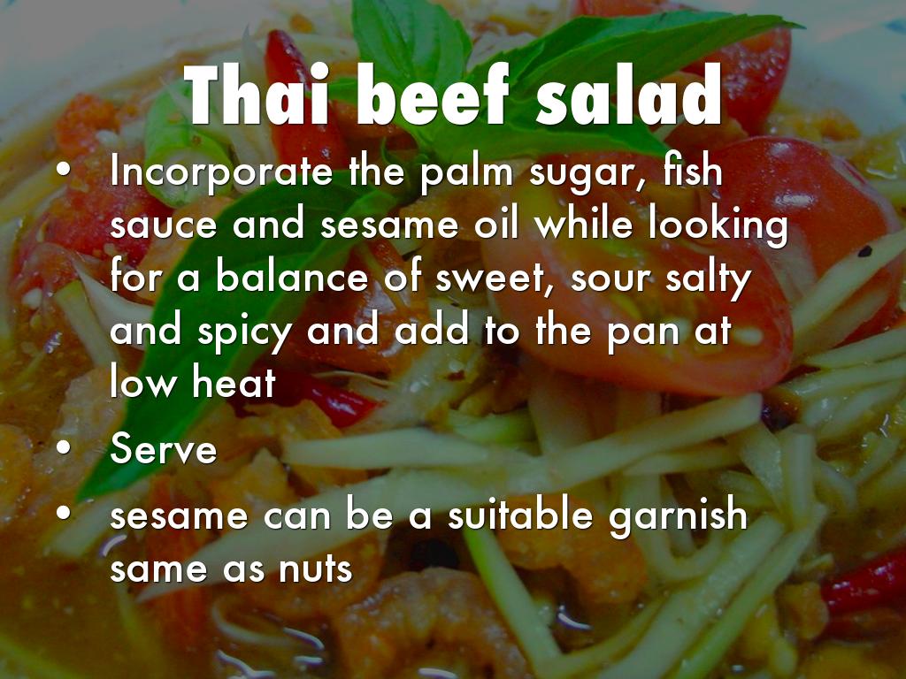 Ingredients:Dark palm sugar, fish sauce, sesame oil, chinese cooking wine, rice wine vinegar, ginger,beef steak, soy sauce, vegetable oil, continental cucumber, red onion, red and green chillie, grape tomatoes