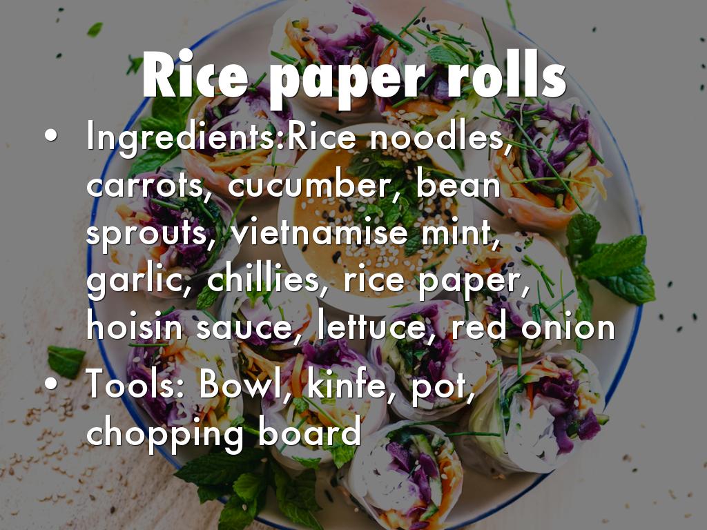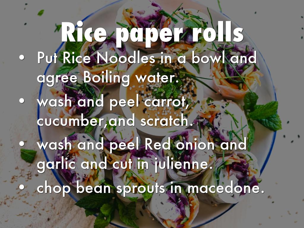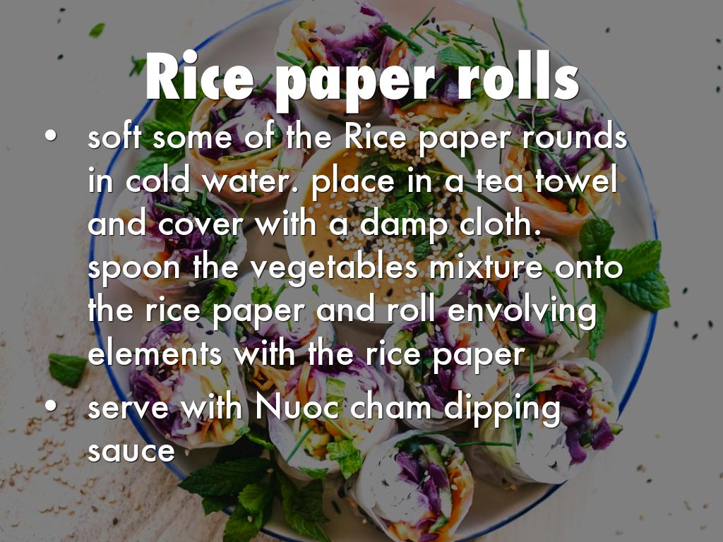 soft some of the Rice paper rounds in cold water. place in a tea towel and cover with a damp cloth. spoon the vegetables mixture onto the rice paper and roll envolving elements with the rice paper