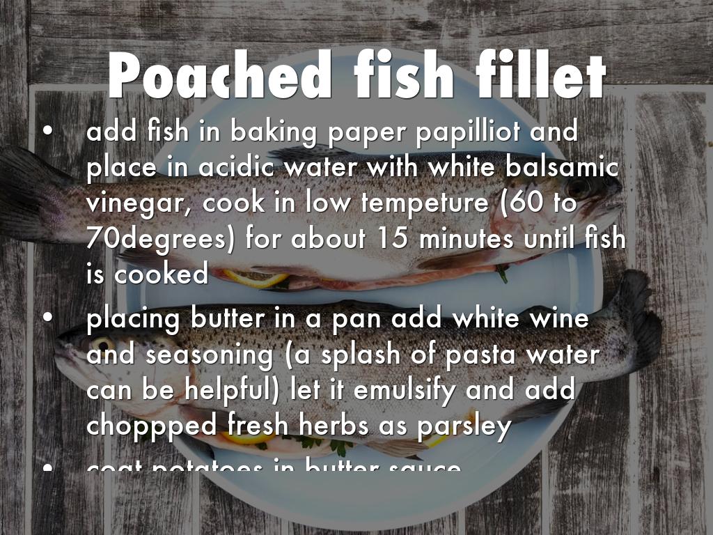 add fish in baking paper papilliot and place in acidic water with white balsamic vinegar, cook in low tempeture (60 to 70degrees) for about 15 minutes until fish is cooked