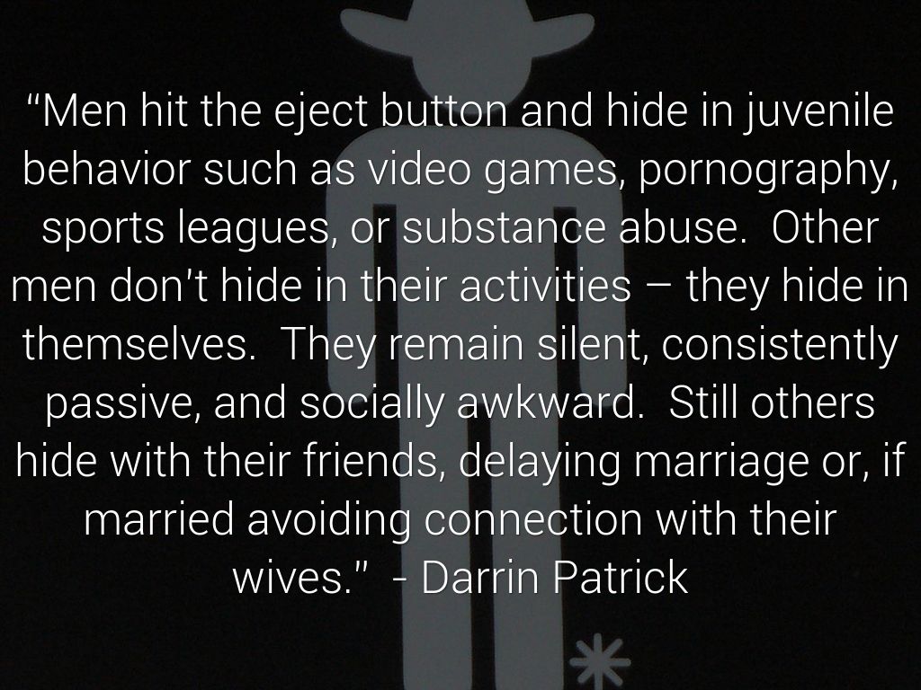 “Men hit the eject button and hide in juvenile behavior such as video games, pornography, sports leagues, or substance abuse. Other men don’t hide in their activities – they hide in themselves. They remain silent, consistently passive, and socially awkward. Still others hide with their friends, delaying marriage or, if married avoiding connection with their wives.” - Darrin Patrick