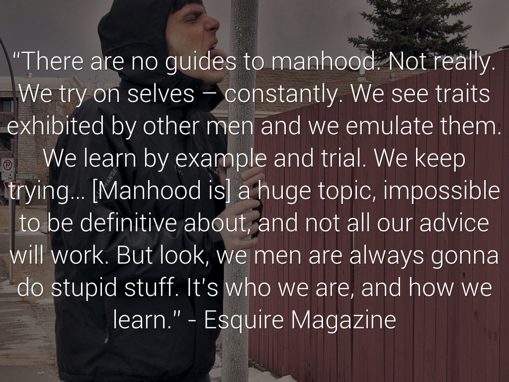 “There are no guides to manhood. Not really. We try on selves – constantly. We see traits exhibited by other men and we emulate them. We learn by example and trial. We keep trying… [Manhood is] a huge topic, impossible to be definitive about, and not all our advice will work. But look, we men are always gonna do stupid stuff. It’s who we are, and how we learn.” - Esquire Magazine