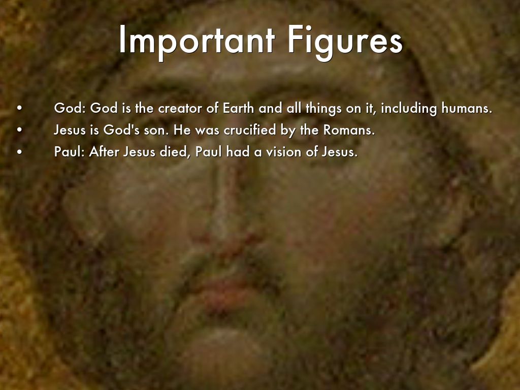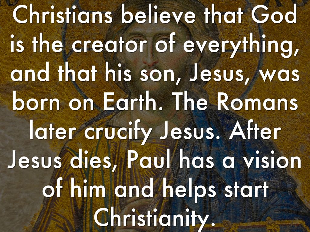 Christians believe that God is the creator of everything, and that his son, Jesus, was born on Earth. The Romans later crucify Jesus. After Jesus dies, Paul has a vision of him and helps start Christianity.