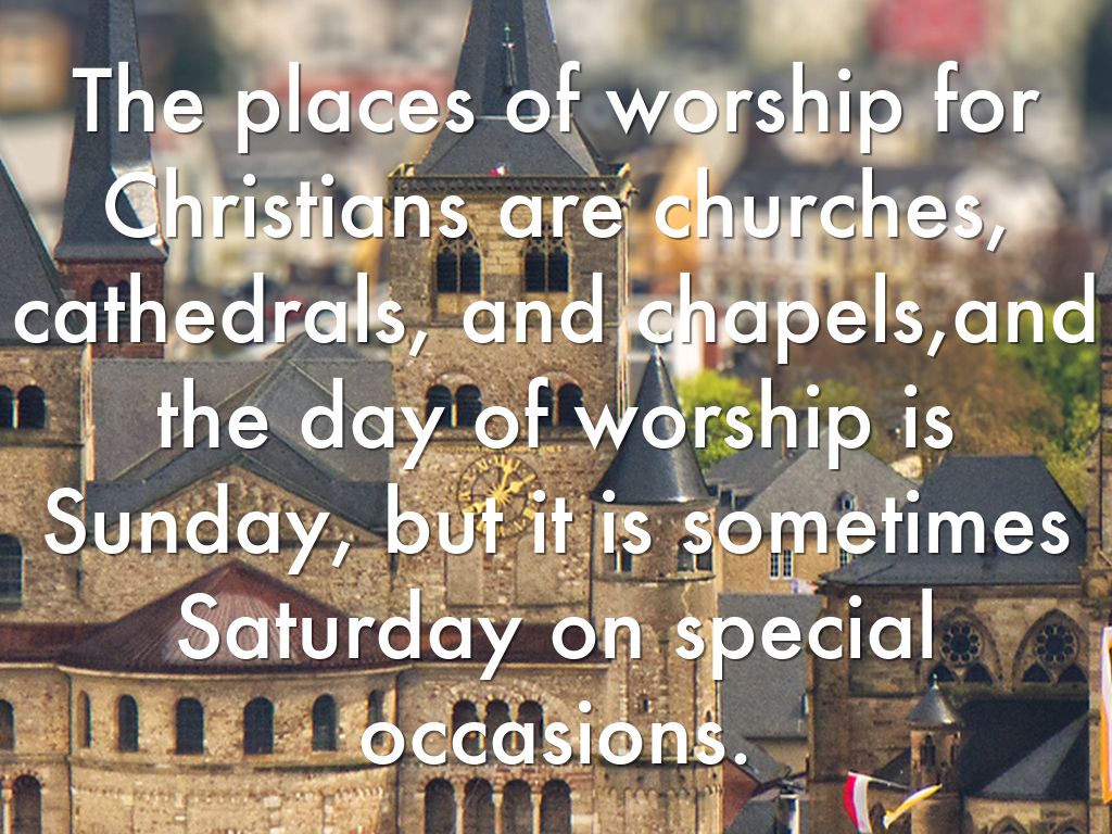 The places of worship for Christians are churches, cathedrals, and chapels,and the day of worship is Sunday, but it is sometimes Saturday on special occasions.