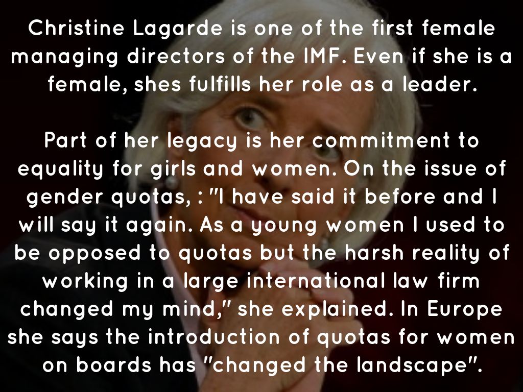 Christine Lagarde is one of the first female managing directors of the IMF. Even if she is a female, shes fulfills her role as a leader.
