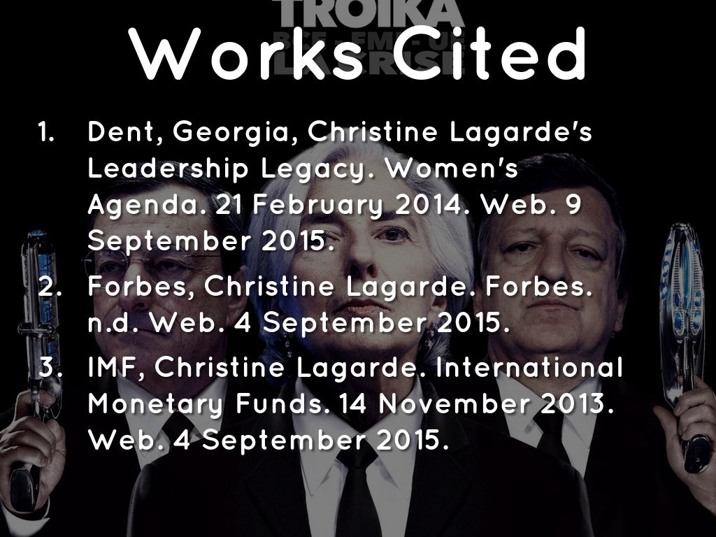 • Dent, Georgia, Christine Lagarde's Leadership Legacy. Women's Agenda. 21 February 2014. Web. 9 September 2015.