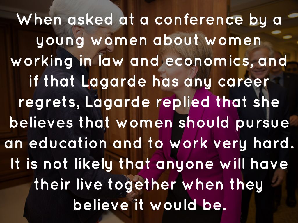When asked at a conference by a young women about women working in law and economics, and if that Lagarde has any career regrets, Lagarde replied that she believes that women should pursue an education and to work very hard. It is not likely that anyone will have their live together when they believe it would be.