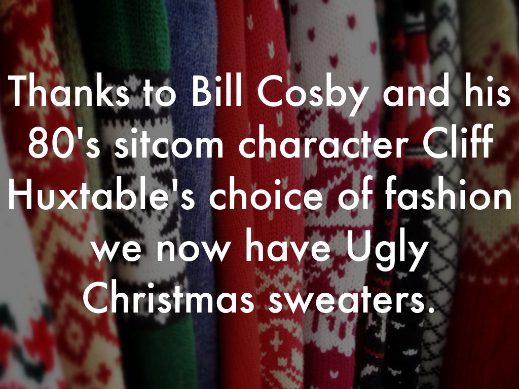 Thanks to Bill Cosby and his 80's sitcom character Cliff Huxtable's choice of fashion we now have Ugly Christmas sweaters.