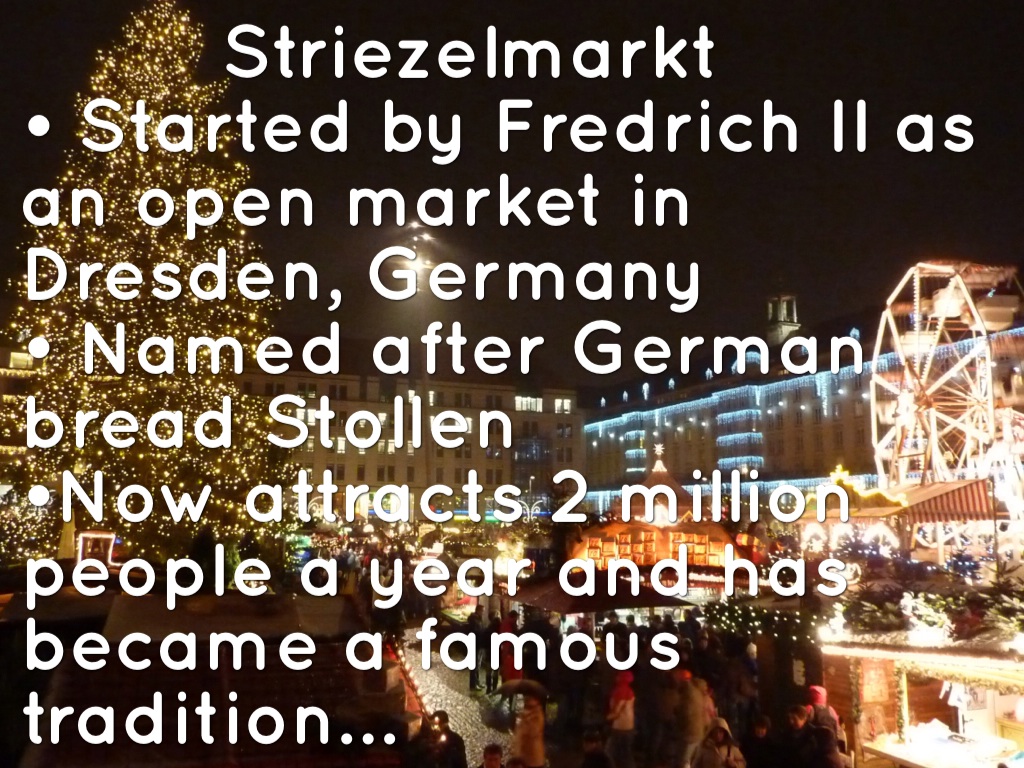 • Earliest documented Christmas Market was the Striezelmarkt in 1434