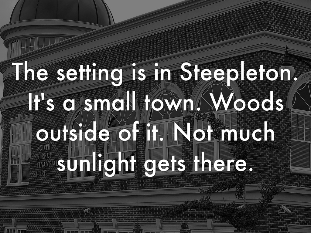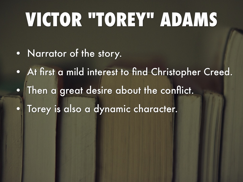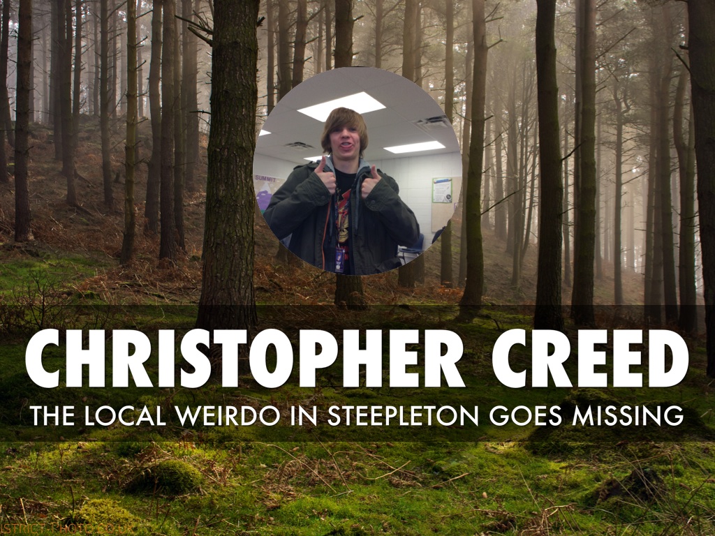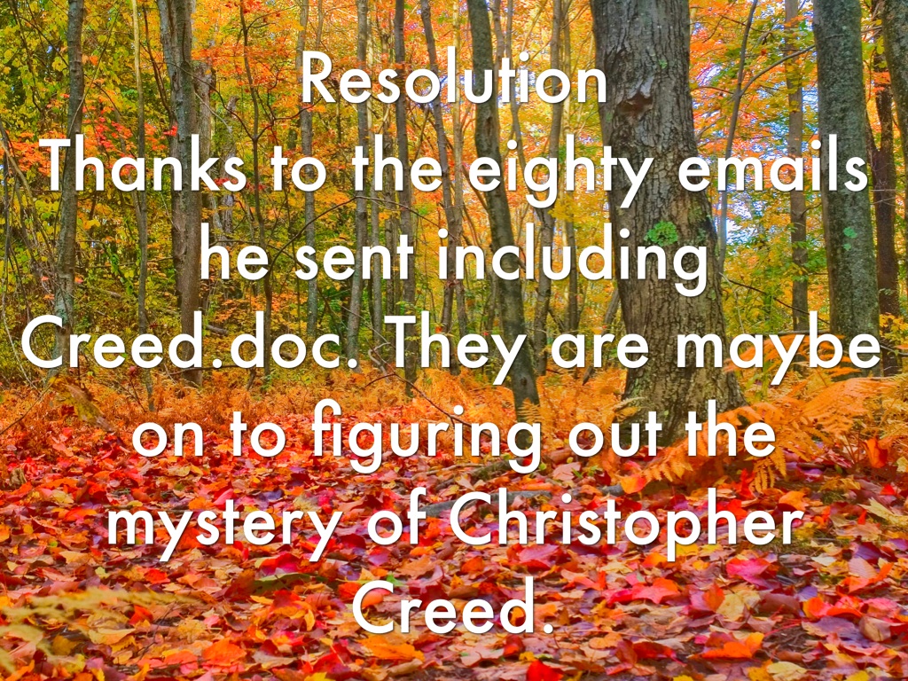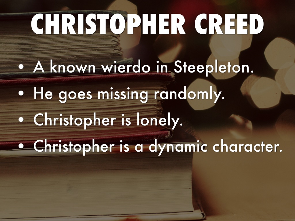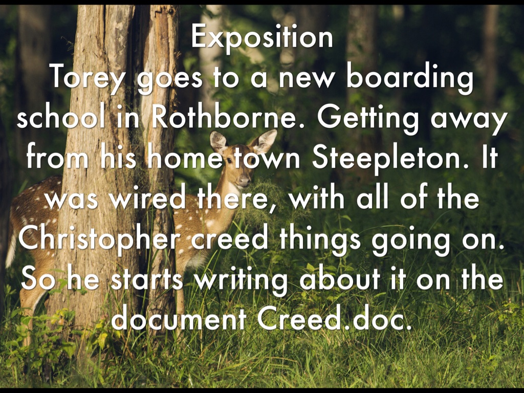 Exposition Torey goes to a new boarding school in Rothborne. Getting away from his home town Steepleton. It was wired there, with all of the Christopher creed things going on. So he starts writing about it on the document Creed.doc.