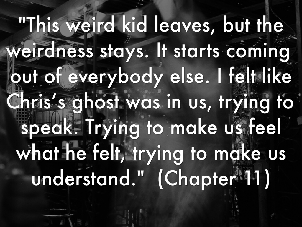 "This weird kid leaves, but the weirdness stays. It starts coming out of everybody else. I felt like Chris’s ghost was in us, trying to speak. Trying to make us feel what he felt, trying to make us understand." (Chapter 11)
