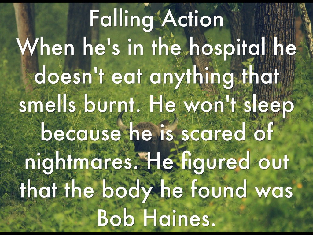 Falling Action When he's in the hospital he doesn't eat anything that smells burnt. He won't sleep because he is scared of nightmares. He figured out that the body he found was Bob Haines.